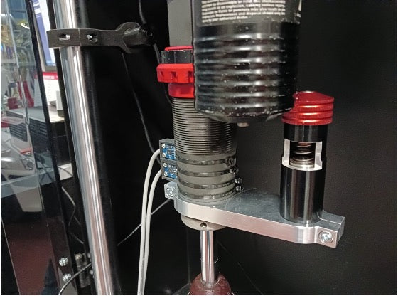 Ambos amortiguadores se conectaron al banco de pruebas con los soportes adecuados y, a continuación, el resonador se conectó al cuerpo del amortiguador a través del soporte de aleación retensada de 2017.